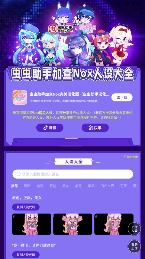使用加查俱乐部人设工具复制人设代码,进入加查俱乐部游戏点击右下角输入框粘贴导入可获得人设;进入游戏角色页面点击输出复制人设代码并全部复制,在工具上传页面粘贴可上传人设代码;游戏内点击小眼睛预览人设图片后截取人物部分可上传截图,非推荐分类含未经验证人设,部分人设实际使用可能与图片不符需自行尝试。