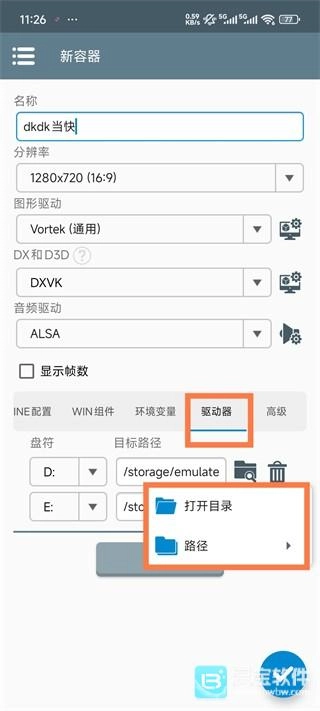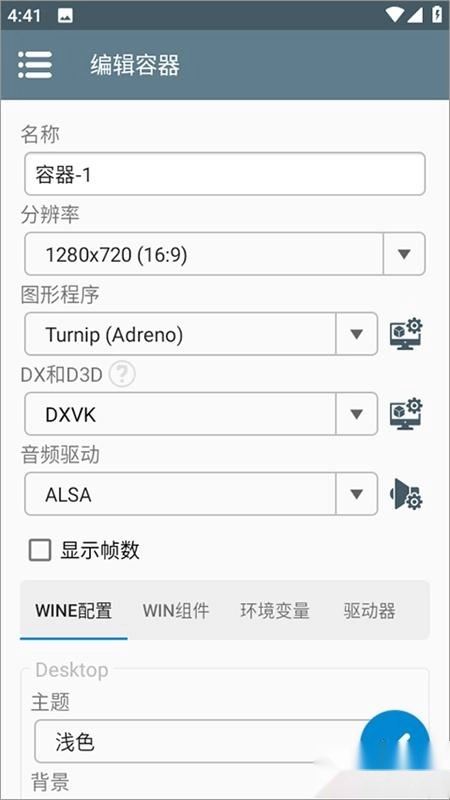 打开Winlator模拟器汉化版等待win自动安装系统文件,点击右上角添加容器,进行配置设置并设置驱动器所在文件夹。
