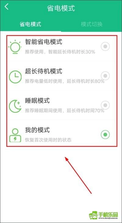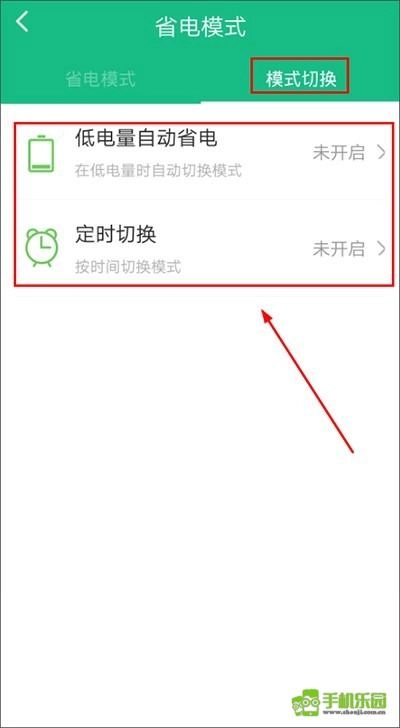 3、点击【模式切换】,这里提供自动设置功能:用户可以设置低电量时自动开启省电模式,也可以设置定时开启省电模式,通过这些设置能让用户更方便地长时间使用手机。