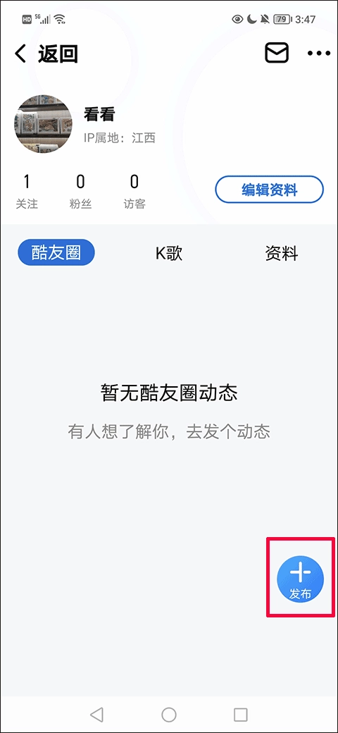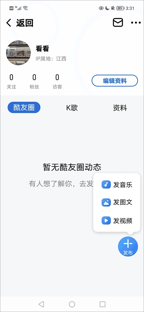 2、在个人主页界面找到并点击“发布”选项,在弹出的选项中选择发音乐;