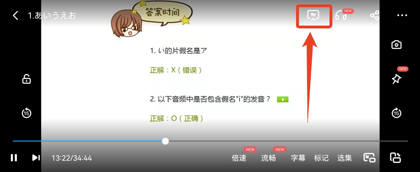 3、播放视频时,点击右上角电视TV图标的投屏按钮。