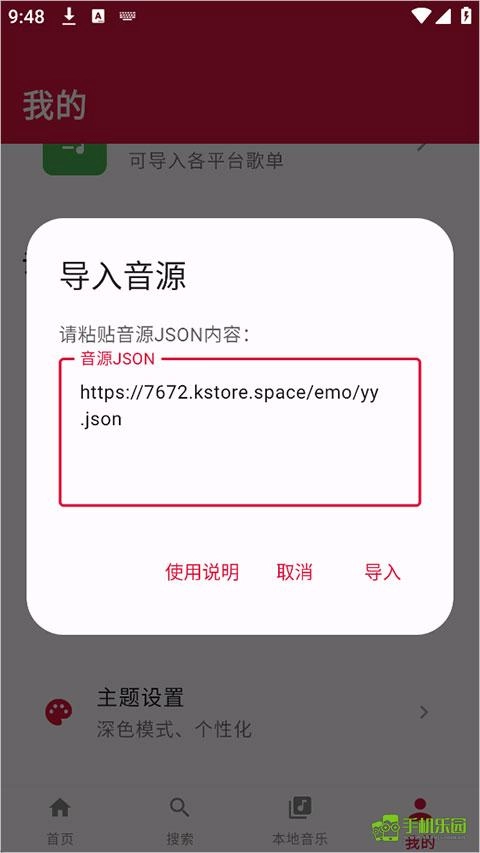 3、然后在弹出的音源导入框中将音源json文件链接复制进来,然后点击【导入】