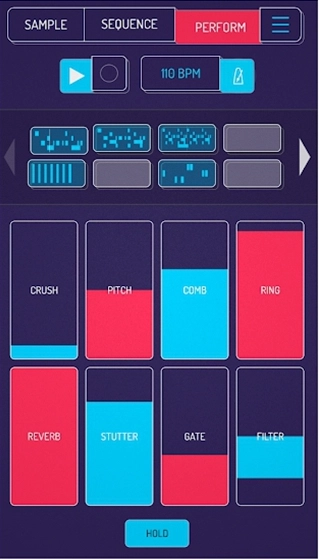 3、点击“SEQUENCE”切换到编曲模式,通过点按已采样的面板来组合节奏,能够创建、复制和调整音块,从而构建出完整的节拍。