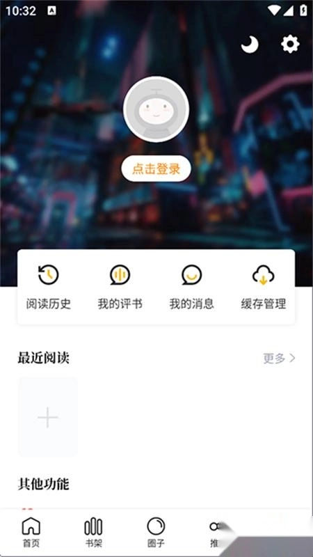 打开漫天星,点击“我的”,点击月亮切换夜间模式,阅读过程中点击漫画中间位置唤起设置,再点击夜间即可开启夜间模式。