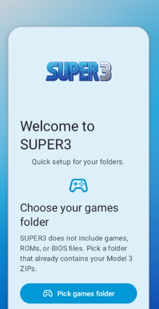 1.打开SUPER3应用后,进入欢迎界面,提示用户进行快速设置。点击“Pick games folder”按钮,选择存放游戏文件的文件夹。