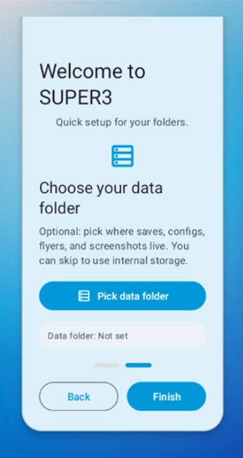 3.回到设置界面后,系统会提示用户选择一个数据存储文件夹,该文件夹将用于保存存档、配置、截图等各类信息。用户既可以点击“Pick data folder”来自定义存储路径,也可以直接点击“Finish”跳过此步骤,使用系统默认的内部存储位置。