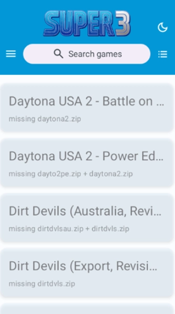 打开SUPER3应用后,进入欢迎界面提示用户进行快速设置,点击“Pick games folder”按钮选择存放游戏文件的文件夹,若所选文件夹因隐私保护限制无法使用需选择其他包含Model 3 ZIP游戏文件的文件夹,返回设置界面可选择数据存储文件夹用于保存存档、配置、截图等信息,用户可点击“Pick data folder”自定义路径或直接点击“Finish”跳过使用默认内部存储,完成设置后进入游戏主界面显示所有已识别的游戏列表,部分游戏缺少必要ZIP文件会提示“missing XXX.zip”需补充完整才能运行,主界面左侧菜单可点击“Pick Games Folder”重新选择游戏目录、“Pick Data Folder”更改数据路径或“Rescan”重新扫描游戏文件,进入游戏详情页面可查看游戏封面、名称及所需文件状态,点击右侧播放按钮启动游戏,搜索功能支持输入关键词查找游戏,游戏列表中点击任意游戏可查看不同版本及缺失文件提示,点击绿色播放按钮尝试运行,点击右上角太阳图标可切换日间夜间模式优化显示效果。