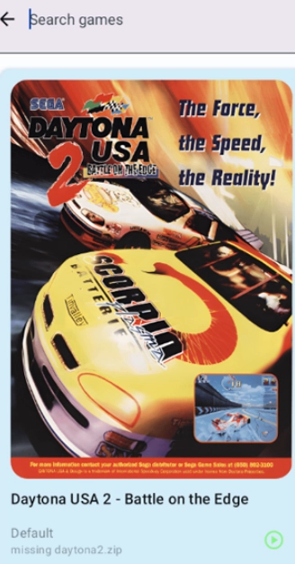 6.进入游戏详情页,比如《Daytona USA 2-Battle on the Edge》,能看到游戏封面、名称以及所需文件的状态。点击右侧的播放按钮就能启动游戏。