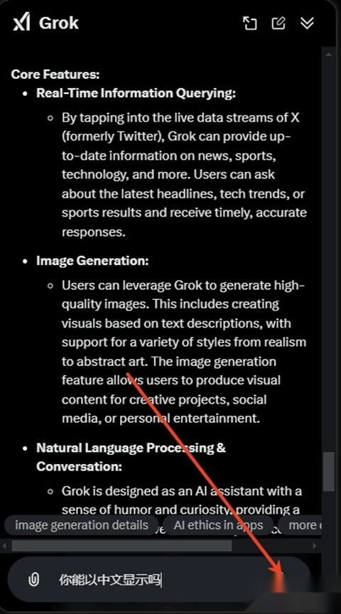 打开软件后点击底部输入框,输入“你能以中文显示吗”并点击发送按钮,Grok就会以中文界面显示。