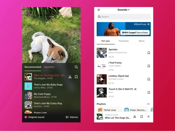 ● 音频库。点击搜索图标即可访问音频库,其中包含热门TikTok音频、播放列表以及搜索特定歌曲或音频片段的功能。