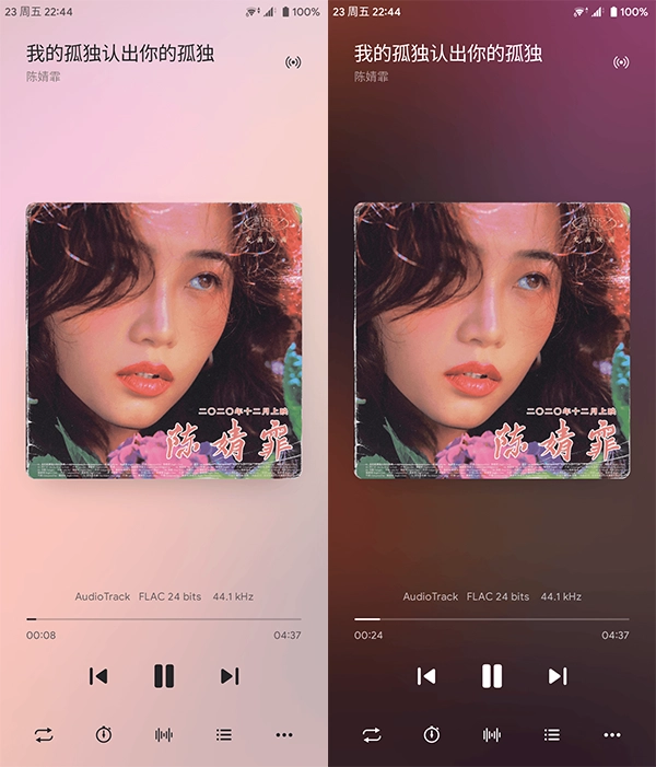 还有一个值得推荐的功能是“动态流光”效果,强烈建议开启。启用后,你可以在Android设备上享受到类似iOS中Apple Music那样的动态模糊背景效果。不过需要注意的是,这种效果在深色模式下表现更佳,而在浅色模式下则不够明显。