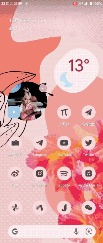 在最新的Android 13版本中,Google对正在播放卡片进行了重大改进,并提供了相应的API供开发者适配。椒盐音乐迅速跟进这一变化,不仅实现了波浪式的已播放进度条,还增加了大尺寸的暂停/播放按钮。