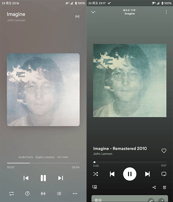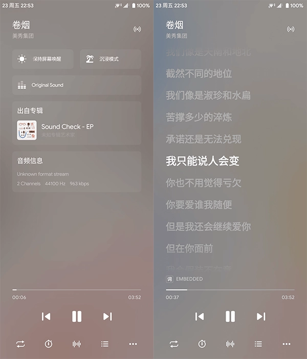 3、进入播放界面后,你会发现它由两部分组成:一侧是专辑封面,另一侧是歌词显示区域。这样的设计让听歌过程变得更加生动有趣。在专辑封面那一侧,还会显示当前播放歌曲的格式类型以及码率数据,这对发烧友而言很有参考价值。此外,播放界面的背景运用了高斯模糊流光效果,用户能够在设置里调整主题颜色和流光强度。