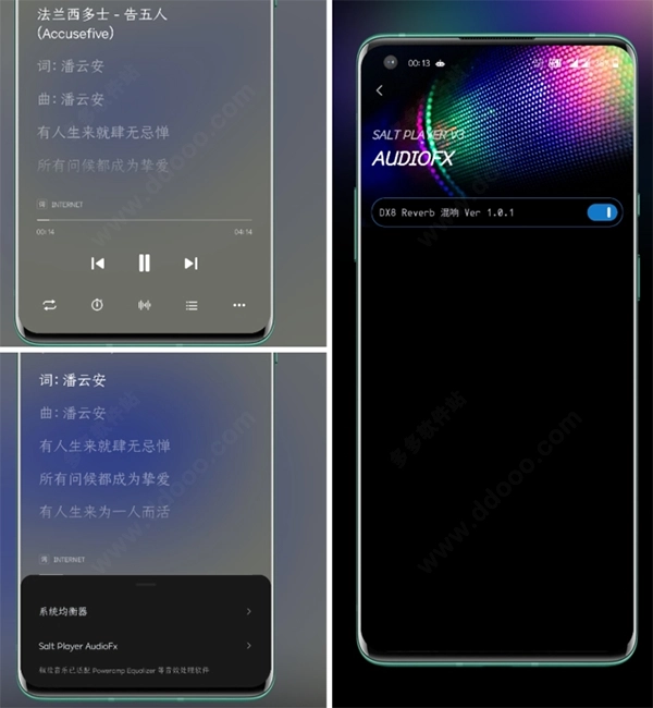4、接下来我们来看看它的独特功能吧。作为一款主打本地音乐播放的应用,自然少不了针对音效优化的功能。在播放界面下方点击中间按钮,可以选择不同的音效模式,开启混响功能后,仿佛置身于音乐厅般的沉浸式体验。