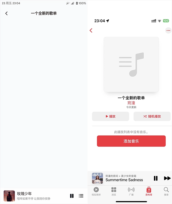 (左侧为椒盐音乐的歌单界面,缺少便捷的操作按钮;相比之下,Apple Music提供了更为完善的功能选项)