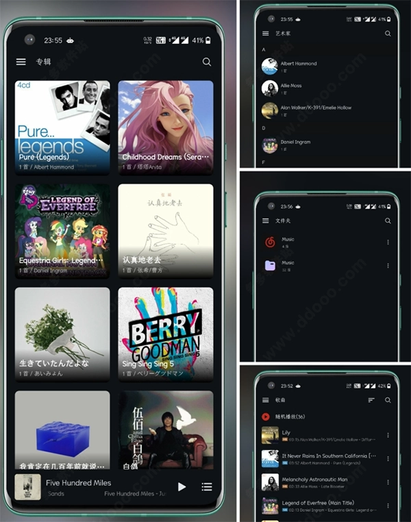 2、打开应用后能直接进入歌曲列表页面,不需要额外操作。除了常规的歌单展示,还可以按专辑、艺术家或者文件夹的分类来浏览音乐库。歌曲列表里还会呈现一些附加信息,像歌曲品质标识,要是高解析度音频,就会标注Hi-Res小金标。